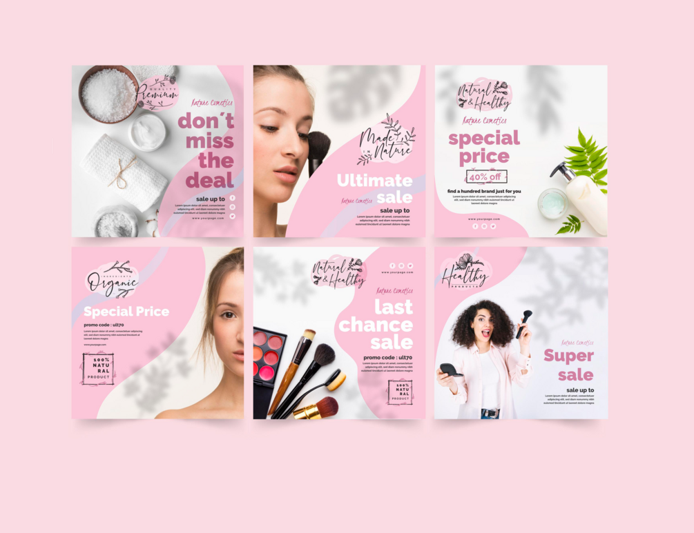Inspiración para la promoción del servicio / productos de COSMéTICA. PACKS de Banners para realizar campañas publicitarias en las redes sociales.